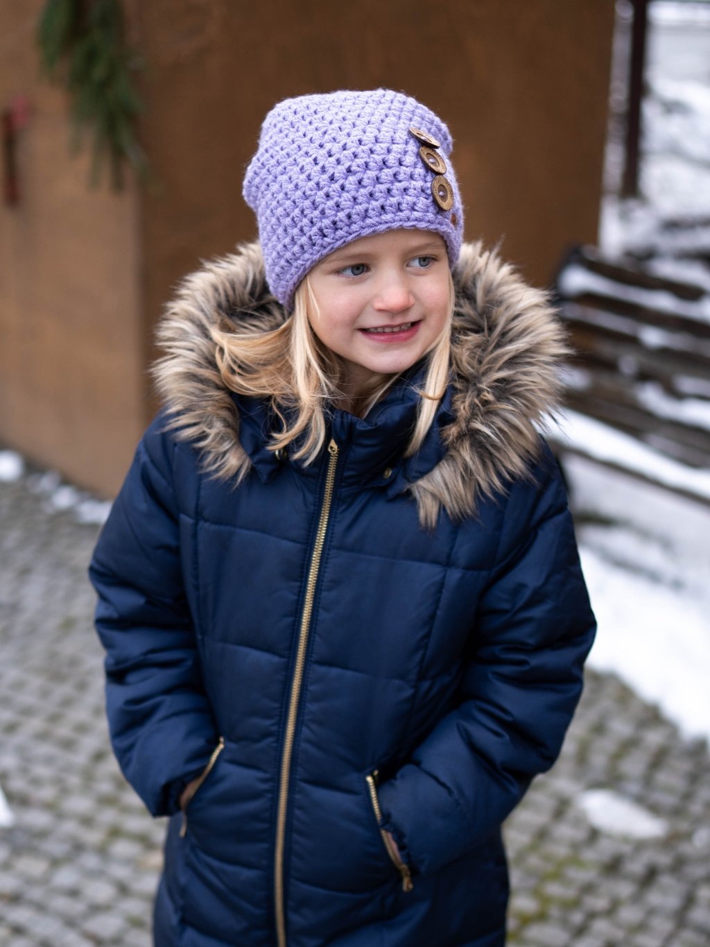 Ručně háčkovaná čepice podšita funkčním úpletem Thermocool, je doplněna dřevěnými knoflíky.