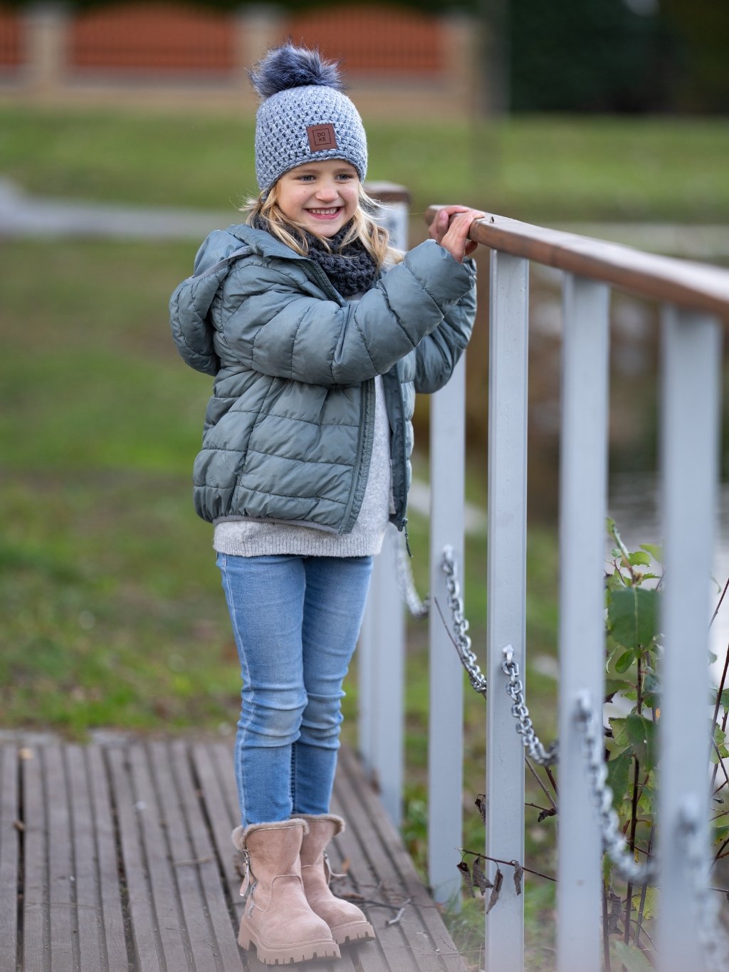Dětský set háčkovaný kulich denim a nákrčník light do 11 let