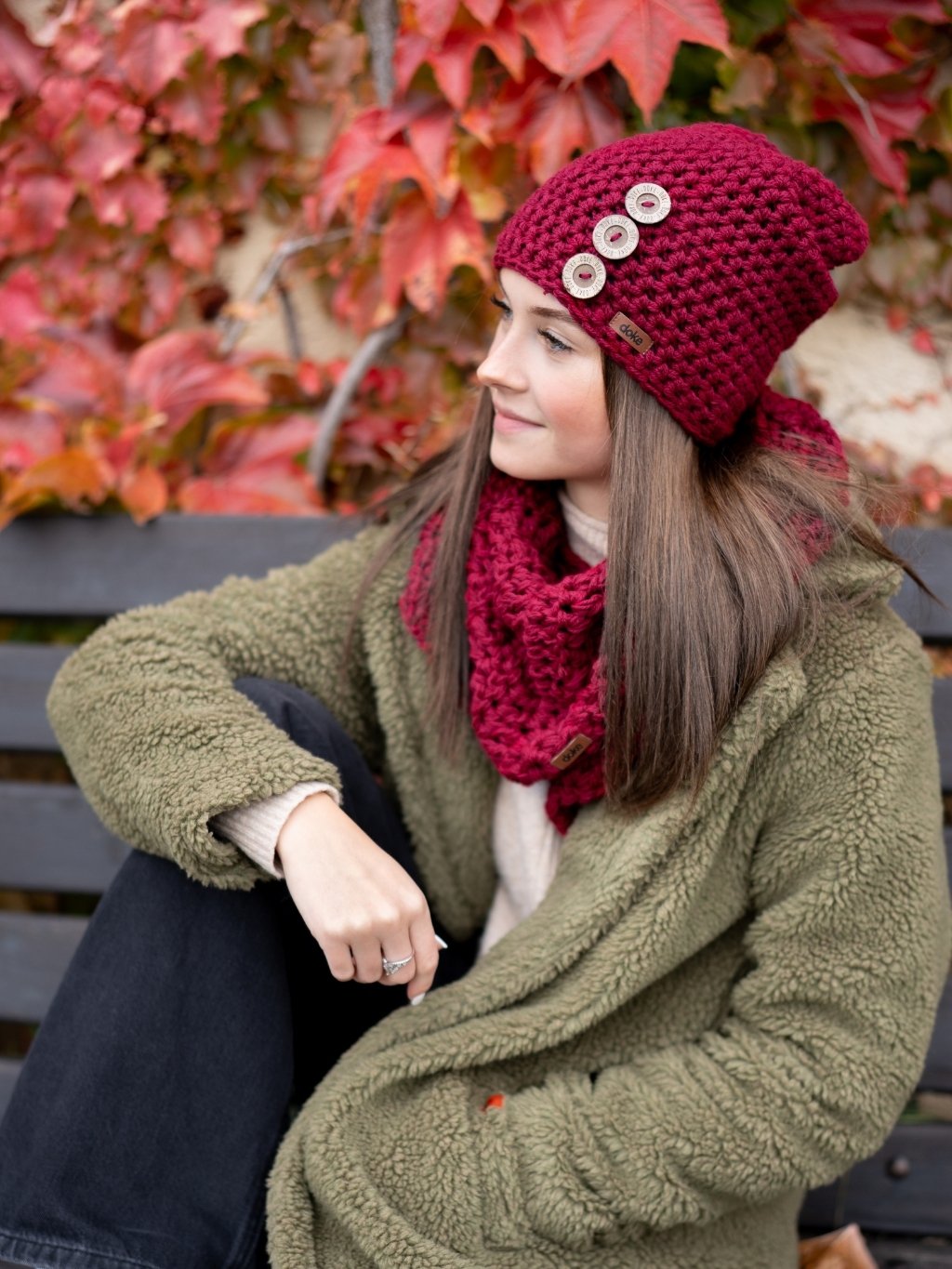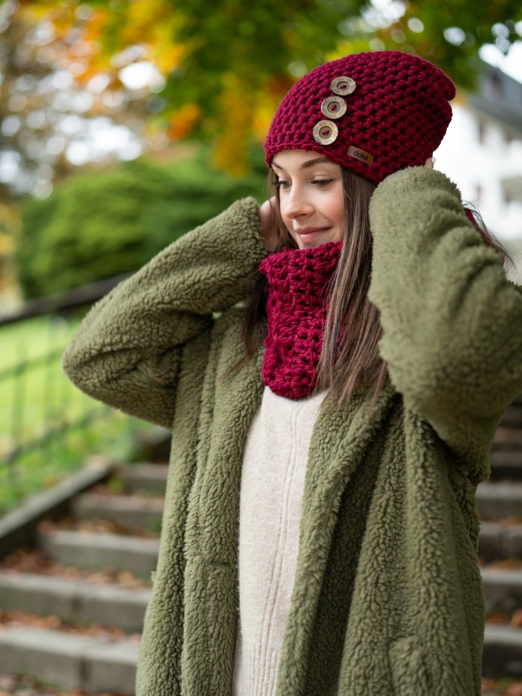 Stylový set čepice a šály, který ve dnech urputných mrazů zahřeje a navíc vyladí každý Váš outfit . Ručně háčkovaná čepice z hřejivé příze je podšitá 10cm pruhem funkčního úpletu, doplněna originálními dřevěnými knoflíky s logem. Doke je ryze česká výroba z jesenických hor.